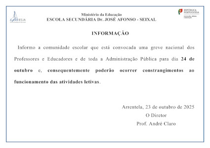 Caro, Encarregado de Educação.Informo que, em virtude da realização de Eleições Autárquicas a 12 de outubro e sendo a Escola Secundária Dr. José Afonso um local de voto, dia 13 de outubro de 2025 (segunda feira), não decorrerão atividades Saiba Mais