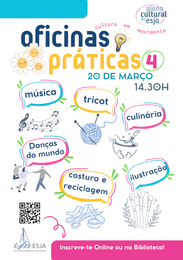 Oficinas Práticas 4 Para celebrar a primavera, vamos realizar as “Oficinas Práticas 4” no dia 20 de março! Vais poder participar em oficinas de tricot, de música, de costura e reciclagem, de culinária, de ilustração e de danças do mundo.