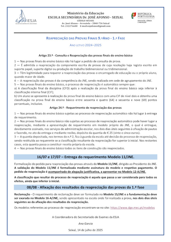 REAPRECIAÇÃO DAS PROVAS FINAIS 9.ºANO – 1.ª FASE