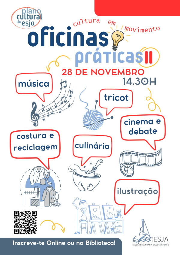 Vêm aí as Oficinas II do Plano Cultural da ESJA! A segunda edição das Oficinas do PCESJA traz novas artes e ofícios nas quais podes participar! Se és aluno da ESJA, inscreve-te no QRcode ou na Biblioteca Escolar! Aparece no dia 28 de novembro, a partir das 14h30, na Biblioteca Escolar!